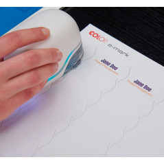 Sello de texto auto-entintado de plástico. Pequeño y ligero. 60% de plástico reciclado. Cambio de cartucho de tinta limpio. Ofrece espacio también para direcciones y mensajes más largos: genera una impresión rectangular. Este formato muy común es particularmente adecuado para direcciones y / o logotipos.