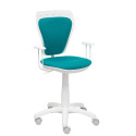 Silla de oficina ergonómica con mecanismo sincro con regulación de tensión y altura ajustable. Respaldo de malla transpirable y asiento de espuma de poliuretano tapizado tela (bali). Carcasa exterior de color blanco. Para uso intensivo (8 horas) puesto que ayuda a reducir las lesiones derivadas de malas posturas. Ideal para la oficina y para el hogar. Con brazos regulables. Base piramidal fabricada en aluminio pulido. Silla giratoria 360º. Ruedas autofrenante de nailon de ø 6cm. Altura total 99/111cm. Alto asiento: 47/60cm.